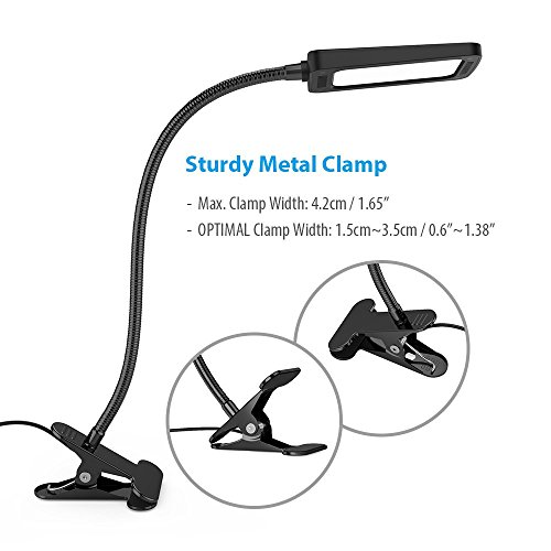 - Clamp Light with Extra-Long Gooseneck. Strong Aluminum clamp opens up to 1.65 width (optimal 0.6-1.38 width) and can be used perfectly with music stands, pianos, office tables, computer desks and headboards. Durable gooseneck design with the length of 50cm/19.7, allows you to adjust your lamp with ease and to direct the light wherever you want.