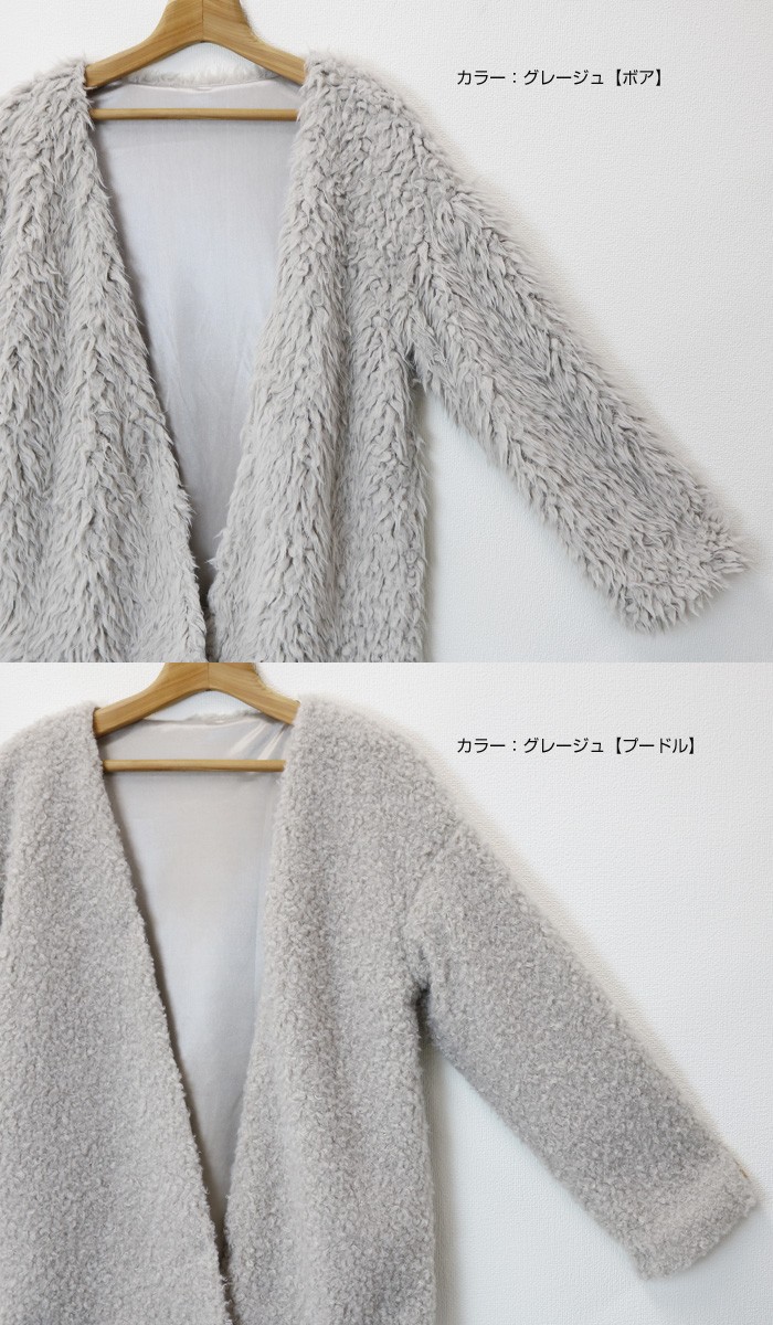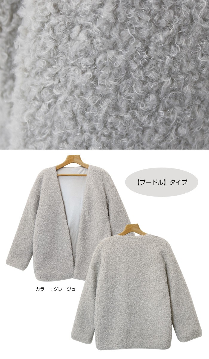 | サイズ | Mサイズ | | 実寸 | 着丈:68cm 身幅:50cm 肩幅:52cm 袖丈:48.5cm 袖口:13cm 裾幅:51cm | | 素材 | (表地) ポリエステル 100% (裏地) ポリエステル 100% | | 生産国 | 中国 | | 裏地 | あり | | 生地の伸縮 | 若干あり | | 生地の透け感 | なし | | カラー | 01. ブラック【ボア】 02. グレージュ【ボア】 03. ピンク【ボア】 04. ブラック【プードル】 05. グレージュ【プードル】 06. ピンク【プードル】 | | 注意点 | ▼綿混合商品は洗濯時に多少縮む事がございます。 ▼パソコン、モニター等の環境により、実際の商品素材カラーが多少異なる場合が御座います。予めご了承ください。 ▼お手数ですが必ずお買い物ガイドを一読頂いてからご利用いただきますようお願い申し上げます。 | |