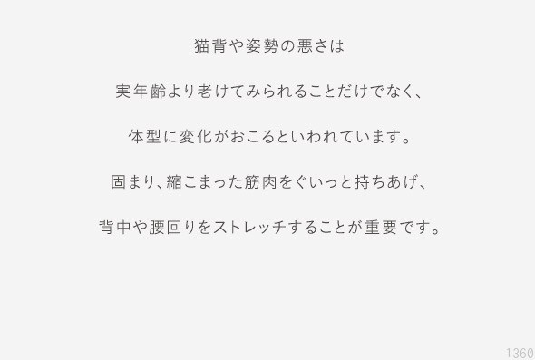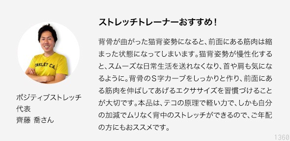 前面にある複数の筋肉をしっかりのばし、背骨のS字カーブを作り出すことで、スッキリとした姿勢で疲れにくい健康的な状態を目指しましょう。