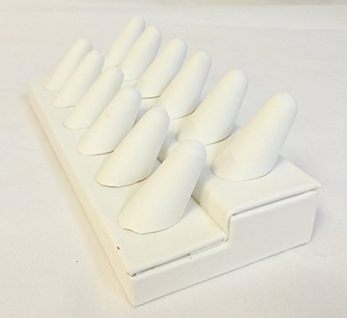 -. Binding : Jewelry -. Brand : FindingKing -. Feature : This is a new white faux leather 12 finger 2 tier ring display / This display holds up to 12 rings / These finger shaped forms are a great way to display rings on your counter tops or in a showcase / This display holds rings size 3 through 11 and measures approximately 8 1/4" x 3 1/4" x 2 1/2" (210 x 82 x 63 mm) -. IsAutographed : 0 -. Model : 245-12LW -. MPN : 53434733 -. PartNumber : 53434733 -. ProductGroup : Jewelry -. ProductTypeName : FASHIONNECKLACEBRACELETANKLET -. Title : Jewelry Ring Leather Display 12 Finger Showcase Fixture
