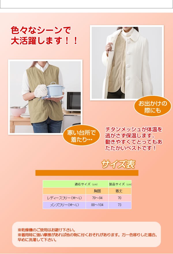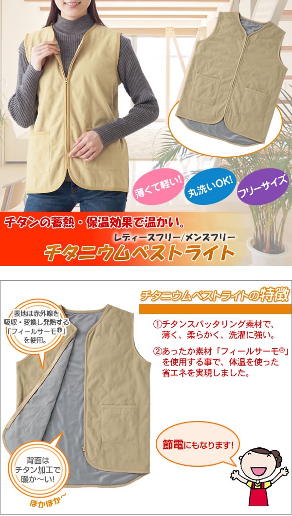 発熱素材「フィールサーモ(R)」とチタンを使った、薄いのに暖かいベストです。冷え込む時期に1枚着込むだけ!薄くてゴワつきません。 サイズ/レディース:M~L(胸囲79~94cm、 着丈70cm) メンズ:M~L(胸囲88~104cm、着丈73cm) カラー/ベージュ 素材・材質/表地:ポリエステル100% 裏地:ポリエステル100% 製造国/中国※お届け地域により、別途運賃がかかる場合やお届けできない場合がございますので、お問い合わせ下さい。