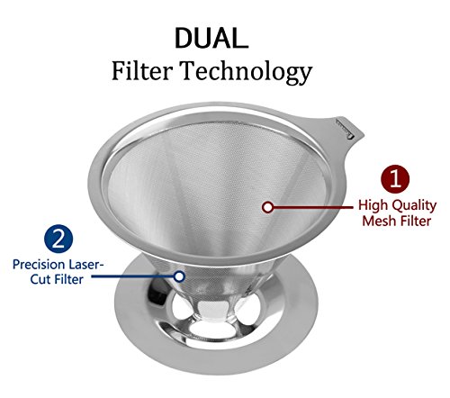 CUP STAND: The specially made of this Coffee Dripper is the cup stand that can fit on most of the glasses, cups, drinking bottles, small pots, thermoses and some carafes. STURDY AND DURABLE CONSTRUCTION: It is made of 304 Stainless steel that is rustless and corrosion proof and stain resistant. It can be reused over and over again. EASY TO USE: Simply place the dripper over the mug, fill the dripper with desired amount of coffee grounds and pour hot water over the coffee grounds until your mug or pot is full. ITfS QUICK AND NO WASTE: about as long as it takes you to heat up your water, then another 30 seconds to a minute to pour and make your coffee. The water passes through the filter easily, keeps all the particles out and no waste. VERSATILE AND PORTABLE: It is a portable device for camping or anytime you want to brew fresh, quality coffee on the go. EASY TO CLEAN: Just rinse the mesh filter under warm running water and dry thoroughly after use.