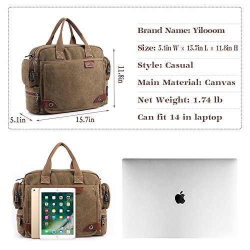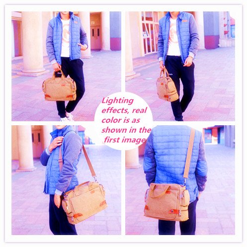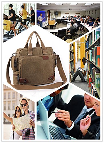 -. Feature : Color: Khaki; Material: high quality canvas & leather, waterproof and scratch-resistant; Lining: cotton cloth. / Dimensions: 15.7L x 5.1W x 11.8H; Weight: 1.65 lb; Not fit for a 15 inch laptop, 13 inches laptop and a 14 inch Vaio will be suitable.(Please allow a little measurement error.) / Various pockets: Exterior: 2 middle zipper pockets in front and back respectively + 4 small zipper pockets on both sides + 2 open pockets in front; Interior: 1 main compartment + 2 drop cases for cards and phones + 1 zipper pocket for VIP objects / With detachable and adjustable shoulder straps for comfortable wearing, no compression feeling. Can be used as handbag or shoulder bag according to your need. / It's a very good bag for working, short traveling, school and daily using. (Warm reminder: there is no padding inside it, Not recommended for laptop computers).