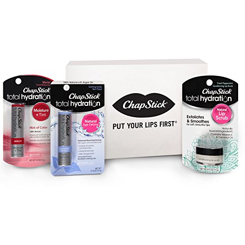 - Each lip kit contains ChapStick Total Hydration Moisture + Tint Merlot, 100% Natural Soothing Vanilla made with naturally sourced ingredients, and Conditioning Lip Scrub.
