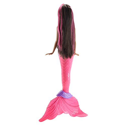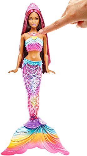 Make a real splash with the Barbie rainbow lights mermaid doll! dip this Barbie doll into water to see her mermaid tail glimmer with colorful lights inspired by a sparkling rainbow. It’s a total wow moment! simply press the button in Barbie doll’s necklace to switch her to “on” mode, and dip her into the tub or pool. The colorful light show starts automatically once her hidden probes are activated by the water. or bring the magic ashore -- you can push the button in Barbie doll’s necklace to enjoy the light show without water. After 10 minutes of inactivity, she will go into “sleep” mode. Rainbow fins, a “pearl”-decorated belt, pink-streaked hair and a princess tiara complete the head-to-toe magical mermaid look. Tell all sorts of fantastic fairytales with this gorgeous mermaid doll. Includes Barbie mermaid doll with light-up feature. Doll cannot stand or swim alone. Colors and decorations may vary.Feature
