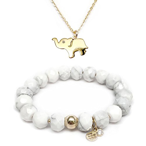 -. Title : Set 10mm White Agate London 7" Stretch Bracelet 20mm Elephant CZ Charm 16" gold Necklace