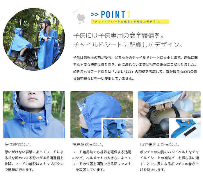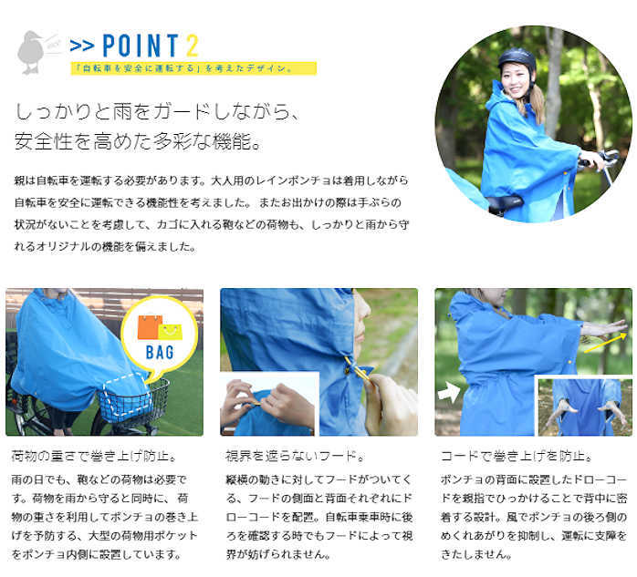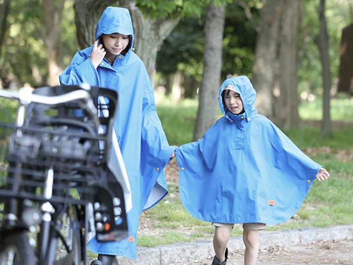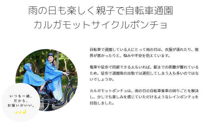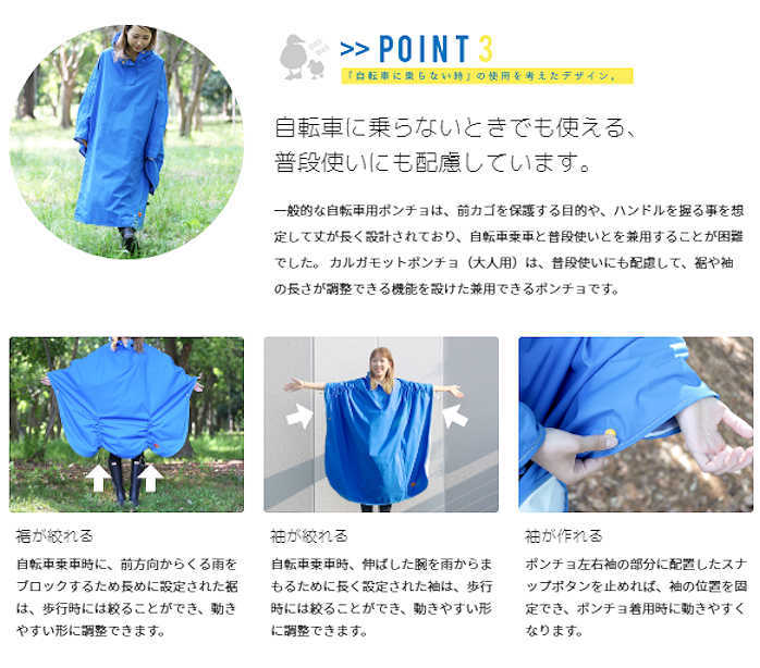 カルガモットポンチョは、雨の日の自転車乗車の困りごとを解決し、少しでも楽しみを感じていただけるようなレインポンチョを目指しました。