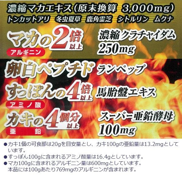 | 原材料 | 名称:クラチャイダム・マカ含有加工食品 黒生姜粉末(クラチャイダム)、マカエキス末、亜鉛含有酵母、馬プラセンタエキス、卵白ペプチド、冬虫夏草末、トンカットアリエキス末、ムクナエキス(八升豆エキス)、鹿角霊芝末/結晶セルロース、L-シトルリン、ショ糖脂肪酸エステル(原料の一部に卵を含みます。) |
