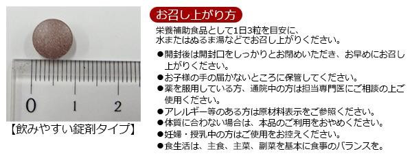 | 栄養成分 | 【3粒中(900mgあたり)】 エネルギー:3.29kcal たんぱく質:0.03g 脂質:0.02g 炭水化物:0.55g ナトリウム:8.62mg (食塩相当量:0.02g) 亜鉛:12.96mg |