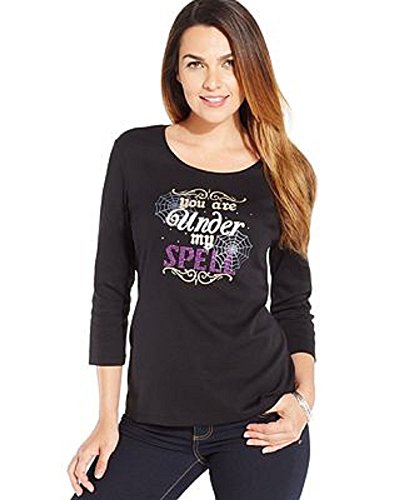 -. Brand : Karen Scott -. Department : womens -. Feature : Easy fit Hits at hip / Graphic print at front: "You are under my spell" / Scoop neckline / Pullover style / Three-quarter sleeves -. PackageQuantity : 1 -. ProductGroup : Apparel -. ProductTypeName : APPAREL -. Title : Karen Scott Petite Under My Spell Graphic Top