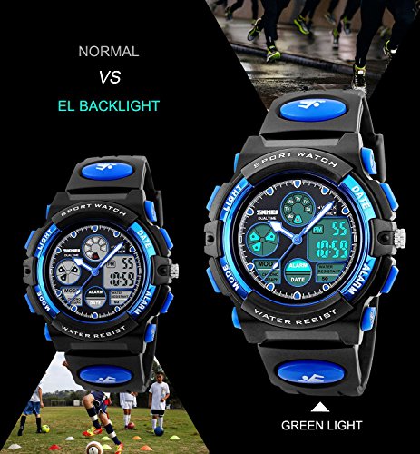 Multifunction: Design Calendar Date Window, 12 / 24 Time Display, Alarm, 50M Waterproof, EL Back Light Display, Shock Resistant, Stopwatch. - COMFORT: High Quality Germany Imported PU Resin Strap, the strap is soft and comfortable and environmental friendly. This design is very suitable for kids.