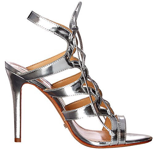 Product DescriptionScalloped straps lend a graphic touch to patent-leather Schutz sandals. Lace-up closure. Covered heel and leather sole.0