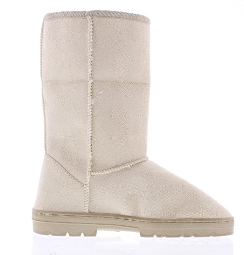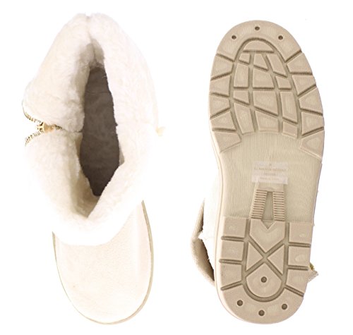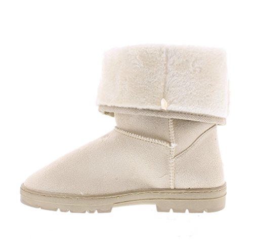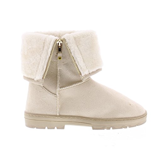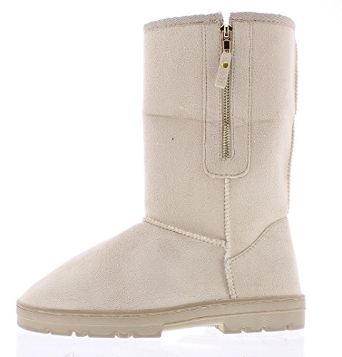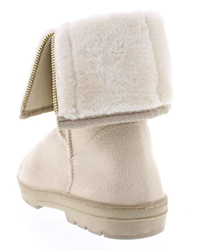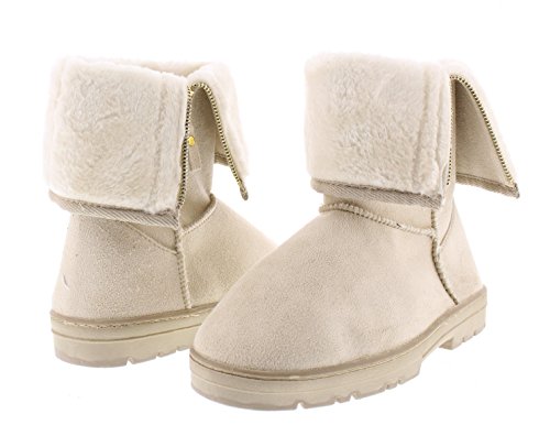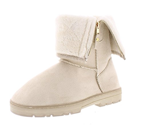 Complete your casual cold weather season look with the cozy GOLDTOE Evette women's faux shearling lined boot. This sandy beige mid-calf outdoor bootie features fully functional side zipper fastening, stitch detailing and durable traction rubber soles. The warm fur lining and adjustable foldover cuff adds comfortable style to this fall and winter season essential. Size and Fit Guide - This womens slip on faux suede fashion boot is available in whole sizes only. If you are a 1/2 size, we recommend sizing up. For example, if you are a womens shoe size 8.5 please order a size 9.