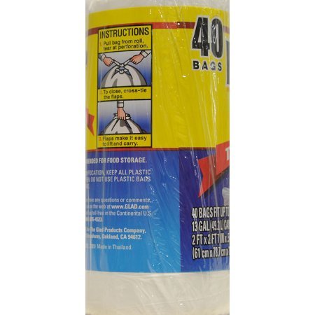 -. Binding : Kitchen -. Brand : Clorox -. Color : White -. EAN : 0783120059157 -. Feature : Tie the four flaps with ease. / Grab the bag by knot. / Toss the secure bag into the garbage. -. Label : Clorox -. Manufacturer : Clorox -. PackageQuantity : 1 -. ProductGroup : Home -. ProductTypeName : HOME -. Publisher : Clorox -. Studio : Clorox -. Title : Tall Kitchen Flap-Tie Trash Bags, 13 Gallon, 40 Count, Clear -. UPC : 783120059157