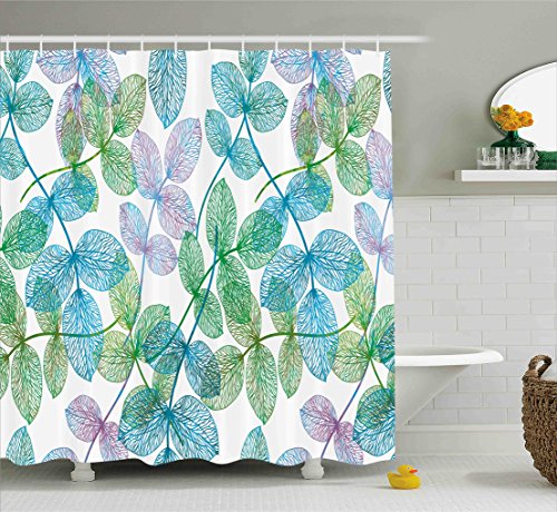 Floral Shower Curtain by Ambesonne, Flowers Leaves Ivy Vein like Rainbow Ombre Colored Art Print, Fabric Bathroom Decor Set with Hooks, 70 Inches, Light Blue Fern Green Purple White