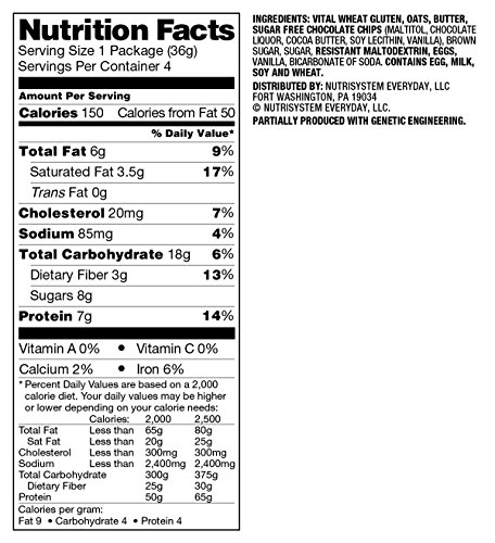 -. Binding : Health and Beauty -. Brand : Nutrisystem -. Feature : Rich, sugar-free chocolate chips abound in these crunchy cookies that go perfectly with a glass of fat-free milk. / They're sure to hit the spot whenever you're craving a little something sweet and decadent. / Nutrisystem® Enjoy-fullTM treats are a great choice for a guilt-free snack! / 7g protein,3g fiber / sugar-free chocolate chips -. IsAdultProduct : 0 -. Label : Nutrisystem Everyday, LLC -. Manufacturer : Nutrisystem Everyday, LLC -. MPN : NS86019 -. PackageQuantity : 1 -. PartNumber : NS86019 -. ProductGroup : Health and Beauty -. ProductTypeName : HEALTH_PERSONAL_CARE -. Publisher : Nutrisystem Everyday, LLC -. Studio : Nutrisystem Everyday, LLC -. Title : Nutrisystem® Enjoy-full™ Chocolate Chip Cookies (8 count)