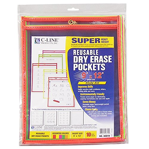 When is a sewn paper holder a teacher’s best friend? When it functions as a Reusable Dry Erase Pocket. Simply insert a worksheet (or any sheet of paper) and use a dry erase marker or dry erase crayon (not included) to write on the pocket. When the lesson is completed, easily wipe the marker off the pocket and use again. The dry erase pockets work with all 8-1/2" x 11" paper. They are also economical because they eliminate the need to copy multiple worksheets over and over again saving you time, money and paper. Practice math problems, letters, writing skills and more with this super heavyweight pocket. Available in an assortment pack of 10 that includes 2 each of neon colors: red, orange, yellow, green and pink. A wide selection of educational worksheets templates for use with C-Line Pockets are available to download on the manufacturer's website at www.c-lineproducts.com. Made by C-Line Products, a leading manufacturer of office supplies for home, school and business. C-Line produces products for storage, identification, organization and protection.Feature