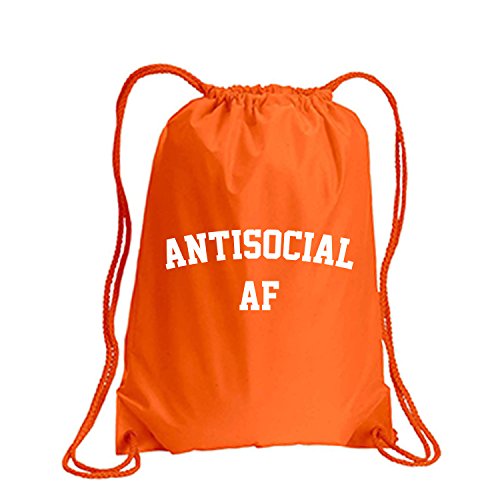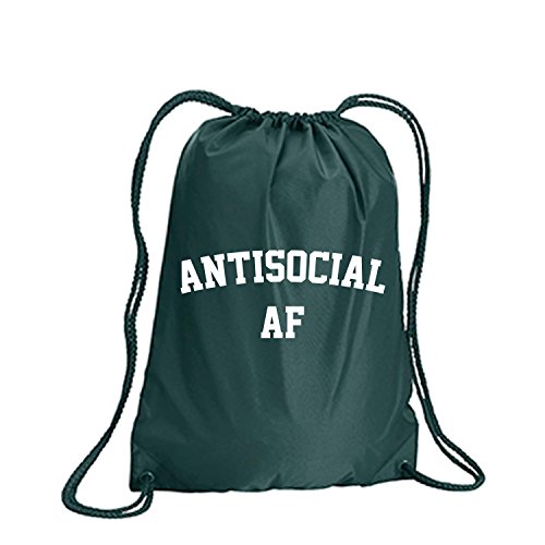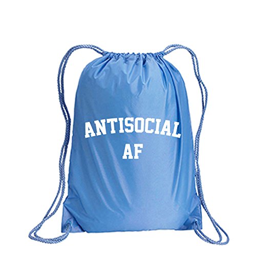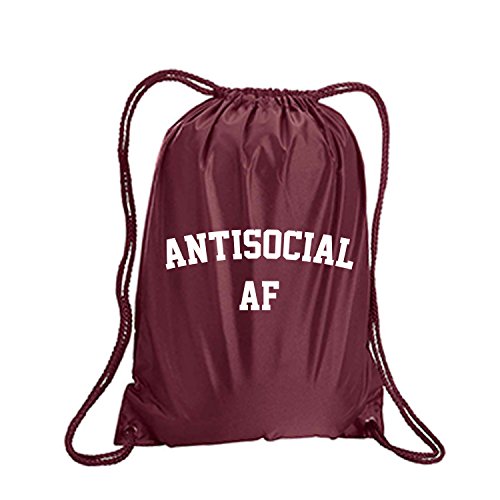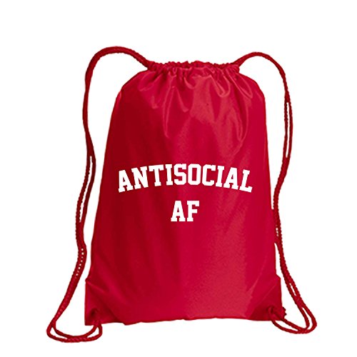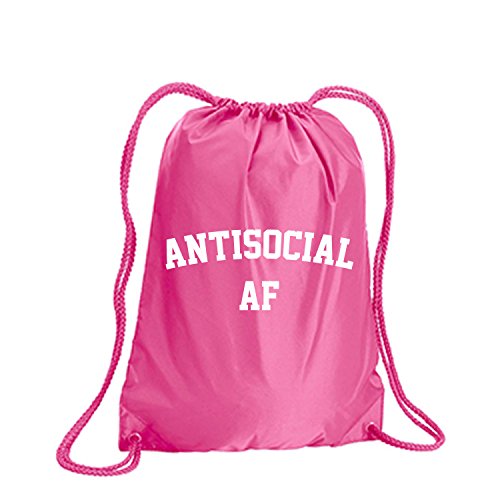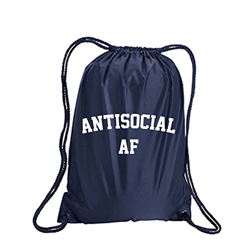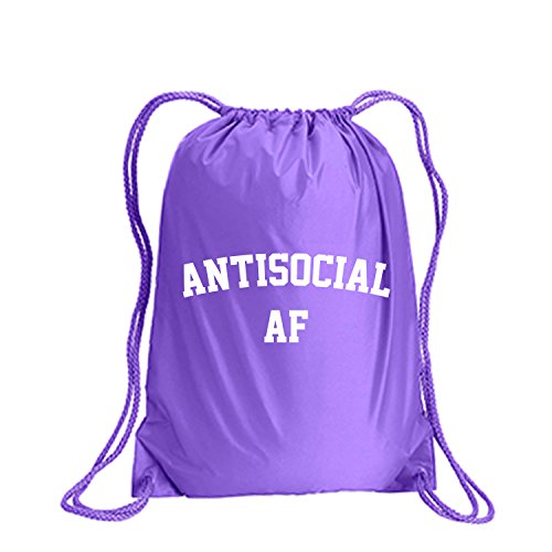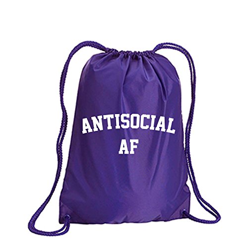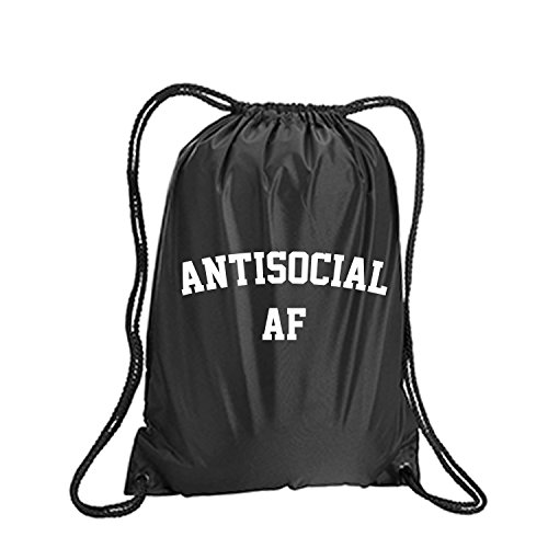 Product Description This durable and stylish nylon tote features "ANTISOCIAL AF" on a cinch pack tote with white ink. Bag comes in small and large sizes and is made of a durable 210 Denier nylon and has color-matched draw cords. Printed in the USA on an imported bag. 0