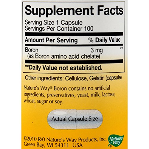 -. Binding : Health and Beauty -. Brand : Nature's Way -. EAN : 6220171998829 -. Feature : Vendor: Nature's Way / Item: Nature's Way Boron Chelate - 100 Capsules / Item UPC No: 33674411018 -. Label : U-Nutra -. LegalDisclaimer : PLEASE NOTE: Product image is representative of the product offered but may not have the exact attributes. Please read product description for the specific attributes of this product. The information above is intended for reference only. While we attempt to keep our information accurate, we cannot guarantee it is an accurate representation of the latest formulation of the product. If you have any concerns, please visit the vendor's web site. The information above are the views of the product's manufacturer. These statements have not been evaluated by the Food and Drug Administration. This product is not intended to diagnose, treat, cure or prevent any disease. -. Manufacturer : U-Nutra -. MPN : 0817221 -. PackageQuantity : 1 -. PartNumber : 0817221 -. ProductGroup : Health and Beauty -. ProductTypeName : HEALTH_PERSONAL_CARE -. Publisher : U-Nutra -. Studio : U-Nutra -. Title : Nature's Way Boron Chelate - 100 Capsules