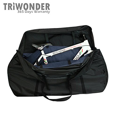 -. Brand : TRIWONDER -. Feature : Made of 420D Polyester. Durable and Waterproof / Portable storage for most sizes and kinds of bicycle. The most convenient way to store your full size bike / Two side pockets with velco straps accommodate the wheels, pedals, and accessories / Can be folded in a small carrying case with two velco straps and two buckle straps, easy to attach to the bike handlebar or carrier rack / With a padded shoulder strap, the carrying bag allows you to transport your bike comfortably -. IsAutographed : 0 -. IsMemorabilia : 0 -. Label : Triwonder -. Manufacturer : Triwonder -. PackageQuantity : 1 -. ProductGroup : Sports -. ProductTypeName : OUTDOOR_RECREATION_PRODUCT -. Publisher : Triwonder -. Studio : Triwonder -. Title : Triwonder Soft Bike Travel Cases Bicycle Carrying Case Transport Cover Bag Carrier Bag