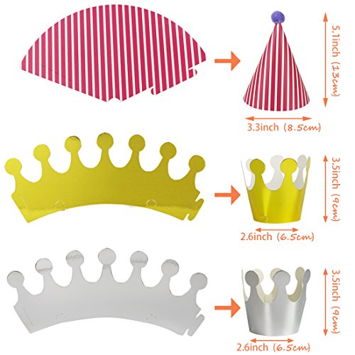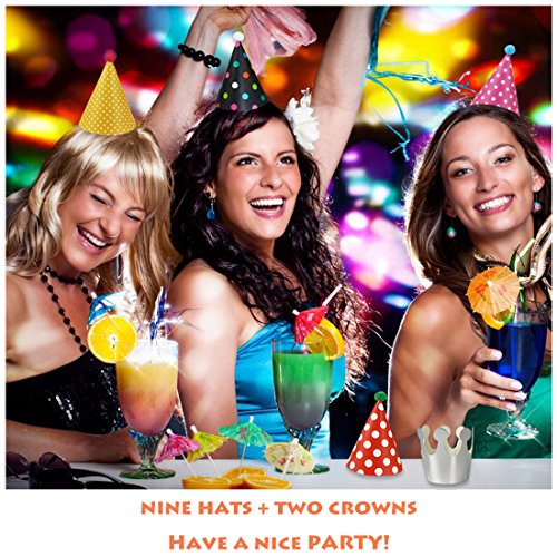 Package Content: You will receive 9 pack cone shaped party hats with size(4.8” height*3.5”diameter) and 2 crowns party hats with size(3.5”height*2.6” Diameter)