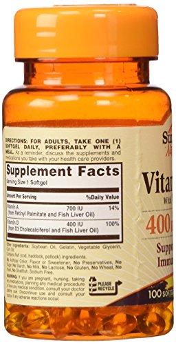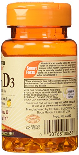 -. Brand : Sundown Naturals -. EAN : 0030768006518 -. Feature : Smart FactsVitamin D is an essential vitamin that assists in a variety of important functions that support bone and immune system health / Sundown Naturals -. IsAdultProduct : 0 -. Label : U.S. NUTRITION/REXALL SUNDOWN -. Manufacturer : U.S. NUTRITION/REXALL SUNDOWN -. MPN : 651 -. NumberOfItems : 1 -. PackageQuantity : 1 -. PartNumber : 651 -. ProductGroup : Health and Beauty -. ProductTypeName : DIETARY_SUPPLEMENTS -. Publisher : U.S. NUTRITION/REXALL SUNDOWN -. Size : 100 -. Studio : U.S. NUTRITION/REXALL SUNDOWN -. Title : Sundown Naturals Vitamin D3 with Vitamin A -- 400 IU - 100 Softgels -. UPC : 030768006518