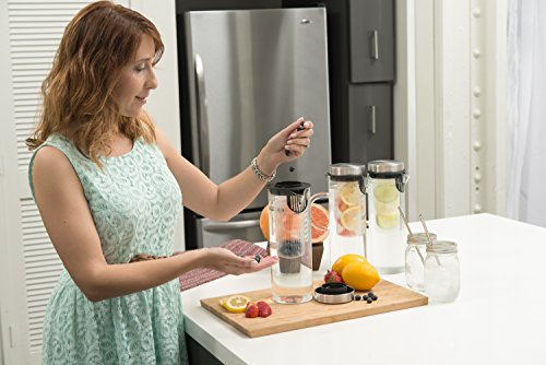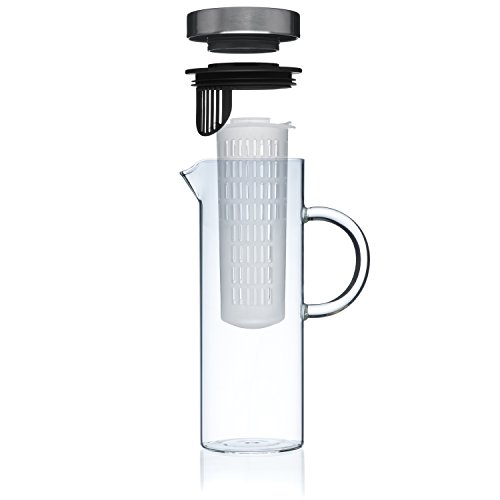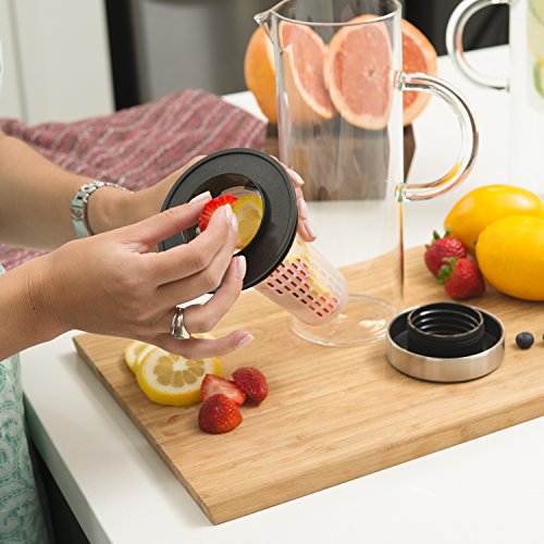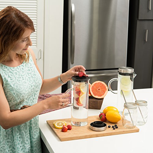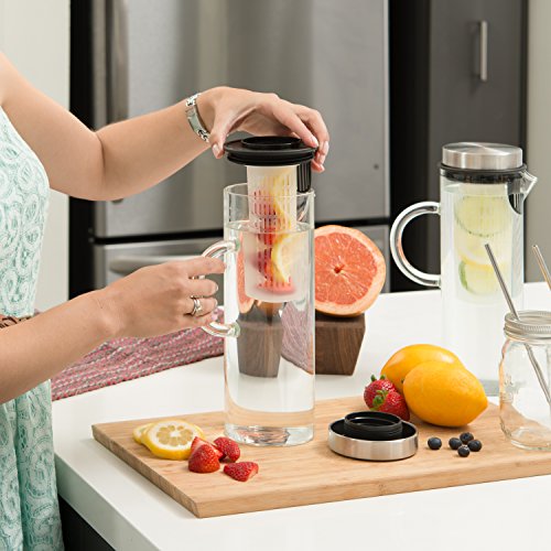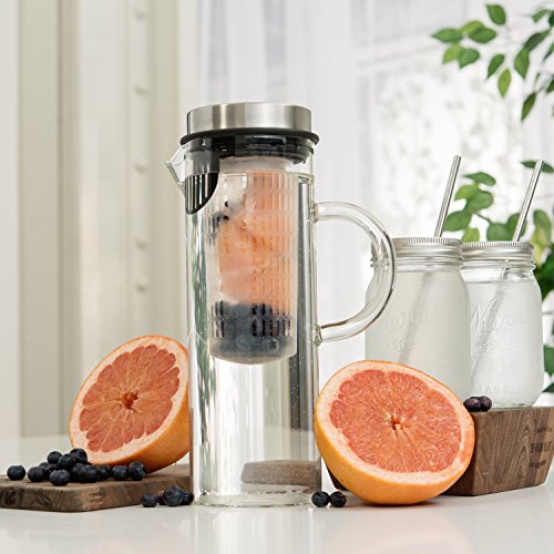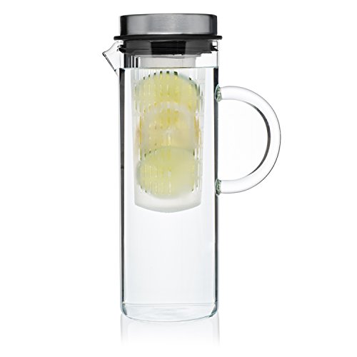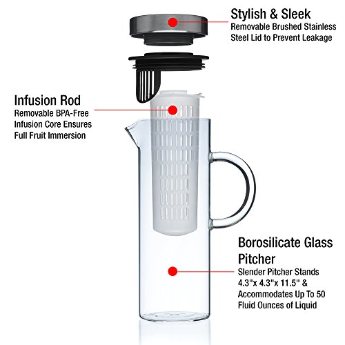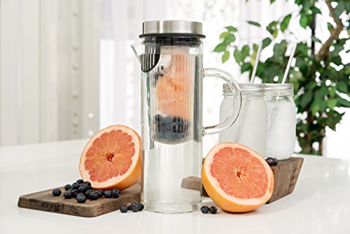 Quality Drinks For Quality People Thanks to the Kitchen De Lujo Fruit Infusion Pitcher, you can infuse boring water with all your favorite fruit and vegetable combinations to make it deliciously unforgettable and even better for your daily health and wellness. From orange/pineapple to mango/cucumber to strawberry/lemon, the possibilities are endless. Fresh, Delicious Versatility Our glass pitcher is ideal for any sort of drink you might imagine, hot or cold. Use our clever infuser to hold your veggies or fruits, and enjoy lemon water, sangria, wine, iced tea, milk, margaritas or even a giant pitch of pre-made mimosas! Plus, you can take the stainless steel lid off, and enjoy using it as a carafe! Product Details: - Clear Borosilicate Glass