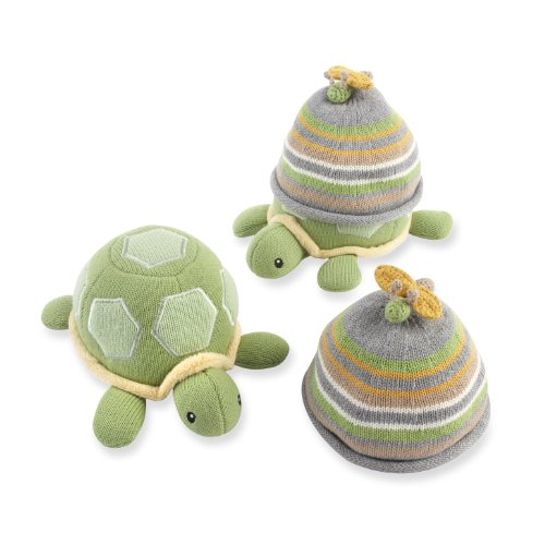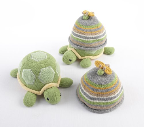 [Product Information]- Soft knit green turtle with rattle noise holds an adorable knit cap for baby boy on its back