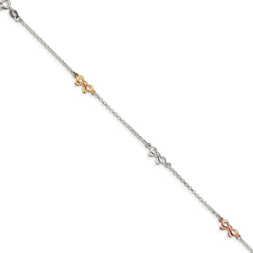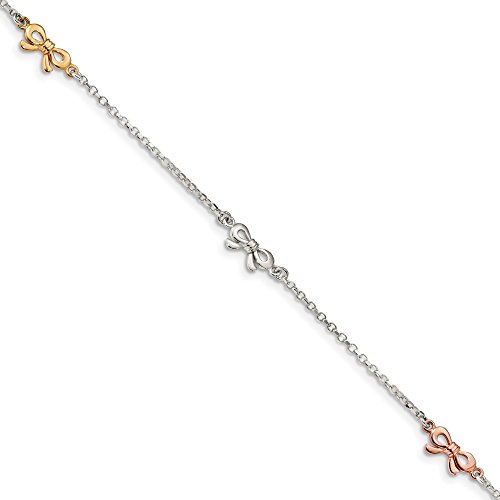 Anklets are a great way to add fun, flash and a feminine touch. This sterling silver ankle bracelet features a 1.5mm rolo chain and three 6mm x 11mm bow charm stations with yellow and rose-tone plated accents. It is adjustable in length from 10 to 10.75 inches and closes with a spring ring clasp. Made in ItalyFeature