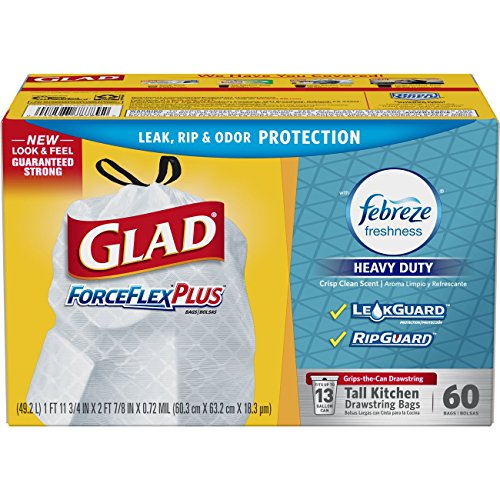 60 count box of 13 gallon Glad ForceFlex Tall Kitchen, Crisp Clean, OdorShield Febreze Heavy Duty
