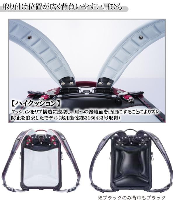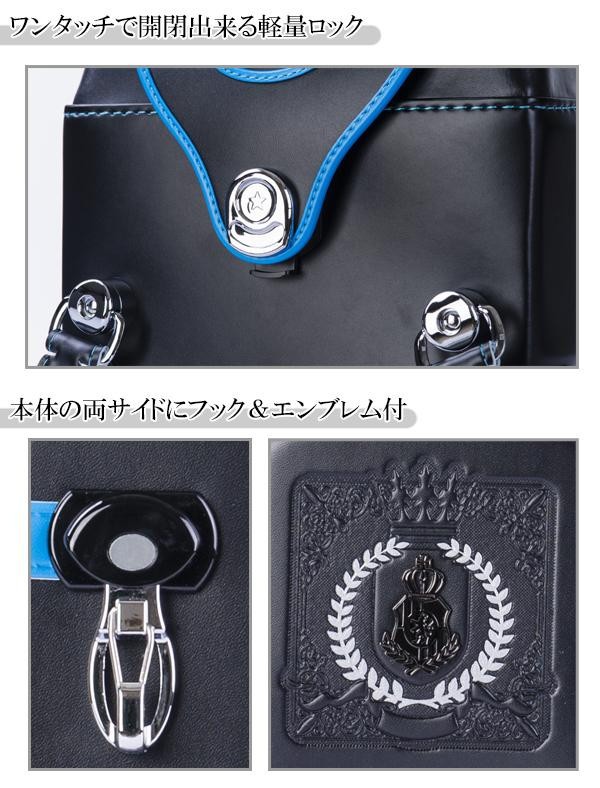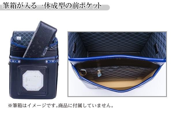 筆箱が入る丈夫な一体成型の前ポケットに、カッコいい型押しとエンブレム反射プリントがおしゃれなランドセルです。 |