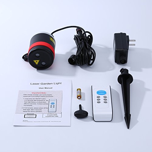 -. Feature : Wonderful Holiday Effect: kinds of red & green spot like the blinking stars on your yard wall, window, or home ceiling, this holiday laser Christmas lights will create a dreamlike romantic atmosphere for your family. / Safety and Waterproof Design: Class 2 laser projector, single beam < 0.9mW. Suitable for Indoor and Outdoor use. IP65 waterproof Design, which can be used in a severe weather (adaptable to -15℉-105℉), and certificates of UL, FDA, FCC, ROSH. / Easy Installation: ground-mounted with stake, plug and play. 5m/16.4ft long cable of the plug provides enough distance. / Remote Control Distance: > 15m/ 49ft. Timer: 2 hours, 4 hours and 8 hours optional. Speed Control Adjustable: static / slow / fast / Wide Application: Perfect for Christmas, Birthday, New Year Parties, Weddings, Landscape, Ceiling, Window, Lawn, yard, and Garden Decorations.