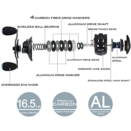 -. Feature : LIGHT WEIGHT - Our lightest baitcasting reel! 'Bulletproof' carbon construction body, side plates, and handle for extreme weight savings, corrosion resistance, and added rigidity. KastKing® Assassin baitcasters only weigh 5.7 ounce (163.5 grams). Go on any fishing mission and cast all day without fatigue. / STOPPING POWER - gives you smooth, impressive 4 disc carbon fiber tournament ready 16.5 Lbs. (7.5 Kg) drag that stops them dead. / DUAL BRAKES - dynamic 6-pin centrifugal and magnetic brakes for laser focus casting accuracy, even with wind drift, lets you hit the bullseye every time. / SMOOTH - 11 + 1 shielded corrosion resistant MaxiDur ball bearings, hard anodized aero-grade aluminum spool, powerful precision matched 6.3:1 ratio gears, instant stop anti-reverse for devastating hook sets, and braid line ready line guide insert. / DAZZLING OPTICS - Midnight black finish with brilliant blue accents. Available with right hand or left hand handle. Best P.R.Ice and features for carbon baitcasting reels. KastKing Assassin carbon baitcasting reels come with a one-year warranty.