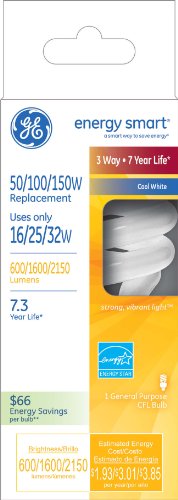 GE Lighting 62070 Energy Smart CFL 3-way 16/25/32-watt 600/1600/2150-Lumen T3 Spiral Light Bulb with Medium Base, 1-Pack