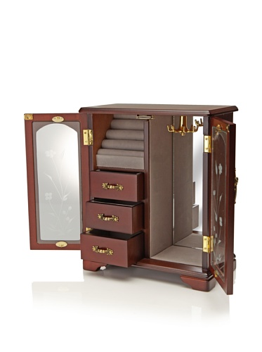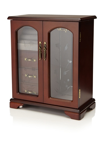 - Finished in a Rich Mahogany with Floral Engravings on the Glass Doors, the Wooden Jewelry Box is a Gorgeous Piece that would look Lovely on any Dresser, Vanity, or Nightstand.