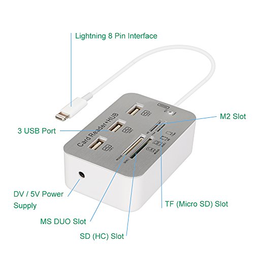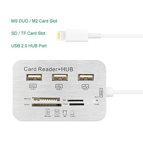 -. Feature : Supports SD(HC), SD(XC), Mini SD, MMC, MMC 4.0, MS, MS Pro, MS Duo, MS Pro Duo, MS Duo MagicGate, M2, Micro SD/T-Flash card. Note: support iOS 10.3 Latest system. / Can connect large current USB devices, such as camera, keyboard, mobile hard disk etc. / Can also all USB decive connected in iPad Working at the same time. / For iPad 4/iPad Mini/iPad Air/iPad Mini 2, compatible with iOS9. / Easy download the photos from digital camera to your iPad.
