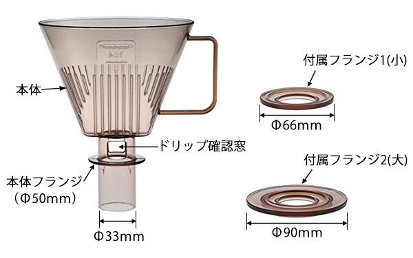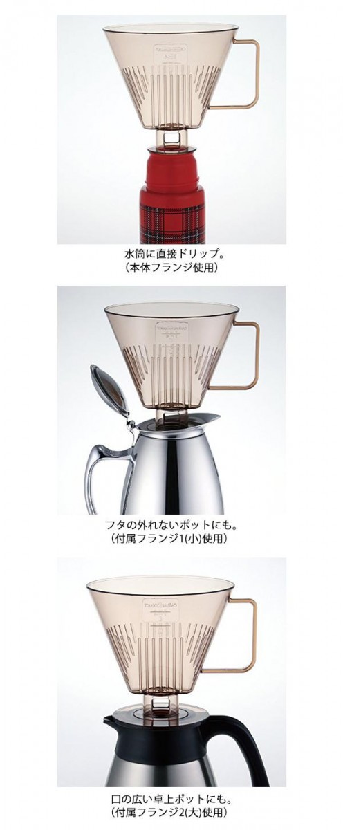 サービスポットや水筒などに直接コーヒーをドリップすることができます。付属のフランジを変えることによっていろんな口径のポットに対応可能。一度の給湯で4杯分(約500ml)のコーヒーがドリップできます。 |