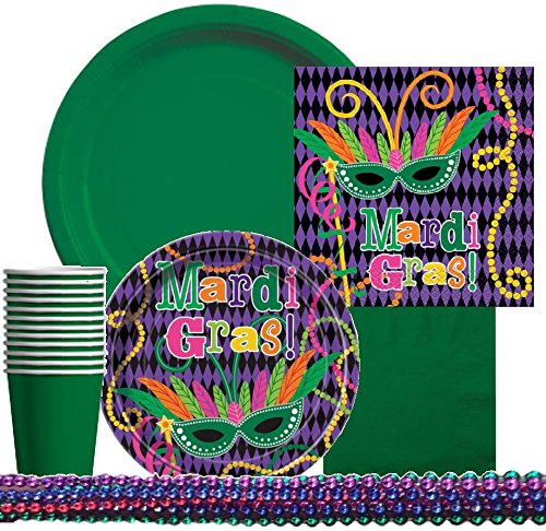 Mardi Gras Party Supplies Pack for 16 Guests - Plates, Napkins, Cups & Beads