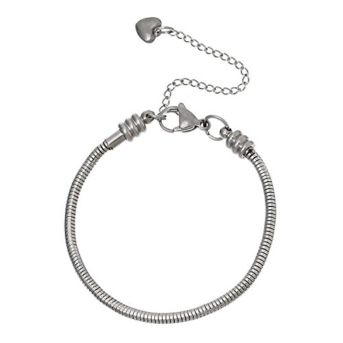 -. Feature : One: European Style Snake Chain Charm Bracelet with Heart Lobster Clasp / Material:Bracelet Stainless Steel(Lead and Nickel Safe)Silver Tone,Will fit all spacers, beads and charms with a core size of 3.5mm and up. / COMPATIBLE fit with Add a Bead bracelets and necklaces brands like Trollbeads Chamilia Biagi Caprice Hallmark Connections Oriana Lovelinks by Aagard Reflections Individuality Storywheel Novobeads Storyvines DaVinci Kays Charmed Memories Ohm SimStars Brighton Zable and Pandora. / The Size Of Lobster Clasp: 15mm x9mm( 5/8" x 3/8"); The Size of Extender Chain: 7.5cm(3") / HIGH QUALITY 304 surgical grade stainless steel resists corrosion and wear, is hypo-allergenic, and nickel, lead & cadmium-free. Beautiful platinum patina is the natural color of this steel and will never wear off, tarnish, or turn colors. STRONG STEEL keeps your charms safe. Does not require regular polishing like 925 sterling silver.
