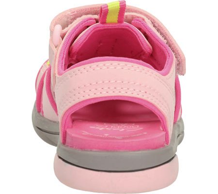 - Feature : Ideal for the beach thanks to their water-friendly properties, these girls' First Shoes closed-toe sandals are a versatile summer staple / A pink synthetic upper is complemented by vibrant yellow trims, while the elastic lace and riptape fastening system with textile pull tabs make on/off accessibility easy / A grippy rubber sole makes this style lightweight and flexible, and it's also fully machine washable / Available in whole and half sizes