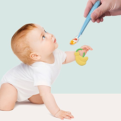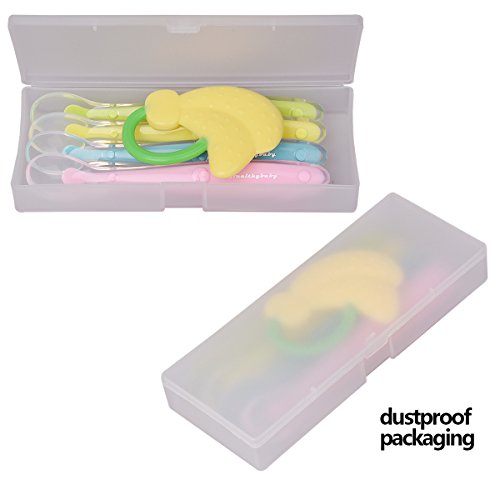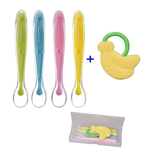 -. Feature : Soft Silicone Material: Baby spoon set and teether are made of soft food-grade, BPA free silicone material, which are gentle on baby's gums even if they are active or hungry, and it is dishwasher safe. / Easy Self Feeding: Ergonomically designed handle is perfect for little hands to hold- Spoon shaped for easy scooping of food-4 different bright colors, which makes children interested in eating. / Sealed Case Package: Portable case for four baby spoons, one teether can be carried conveniently when going out- perfectly protect them. And you don't worry about when one of them slip, there are four. / Adding a Banana Teether: Sometimes baby tend to cry, especially when they are hungry, this teether is the best when you prepare food. This offers amazing value and is perfect for your baby as a gift. / Guaranteed:We believe in providing the highest quality, safest, silicone baby spoon set and teether to our valued customers; you will love your baby spoons or get a full refund; guaranteed.