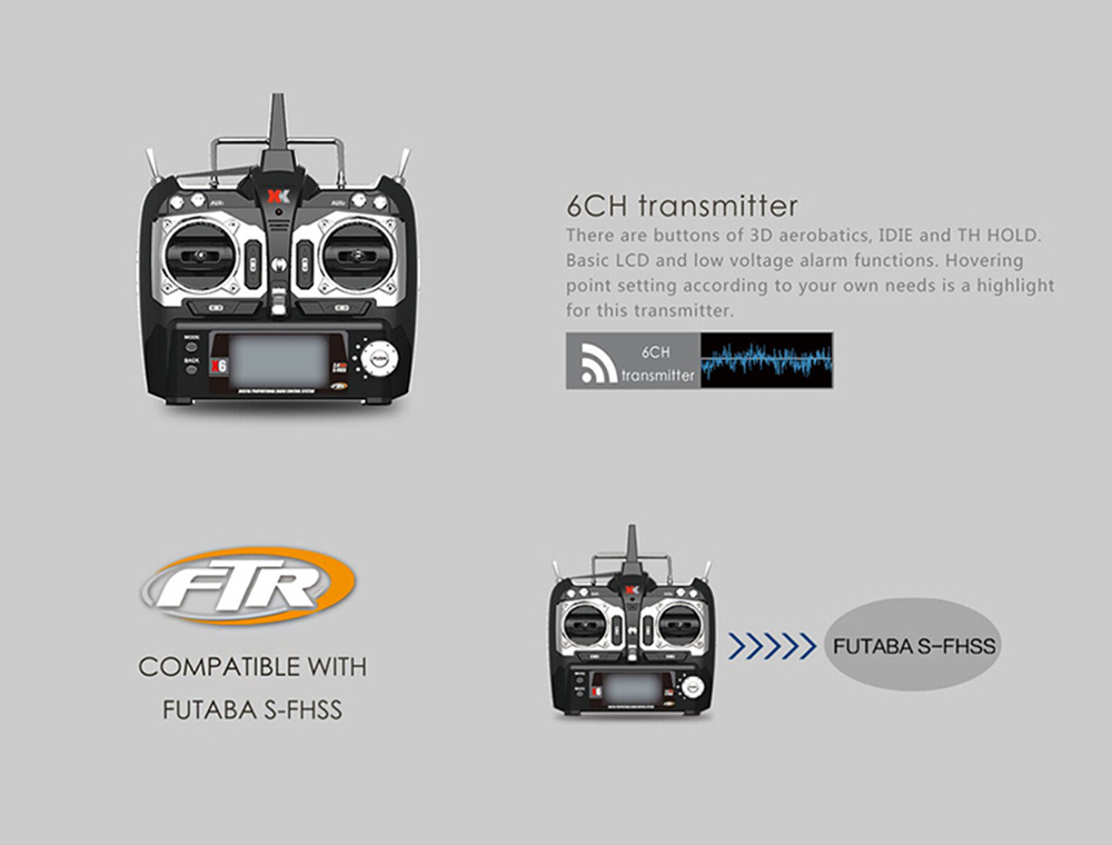 Transmitter supports switching between 3-axis & 6-axis gyro modes.