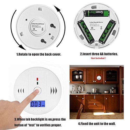 - ◆ ENERGY-SAVING — Operated by 3 x 1.5V AA batteries (not included), The alarm sound pattern is 4 beeps every 5seconds for the first 4 minutes. In 4 minutes, it will change to 4 beeps ever minute to save the battery.