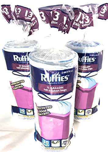 Ruffies 13 Gallon Tall Kitchen Bags Drawstring 30 Count Unscented, Odor Control (3Pack)