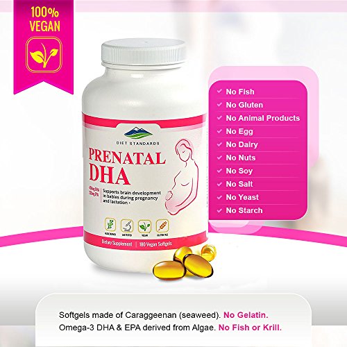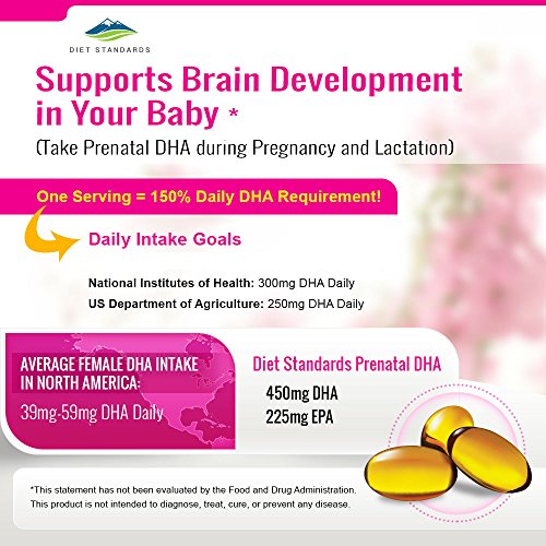 NATURAL INGREDIENTS — Made in the USA. Diet Standards Prenatal DHA Supplement contains 450mg DHA derived from Algae grown in a clean, sustainable environment. Plus 225mg EPA (from algae) to create the ideal Omega-3 blend for you & your baby. Omega-3 DHA is a fatty acid that has been shown to play a big role in baby brain, nervous system, and eye development.