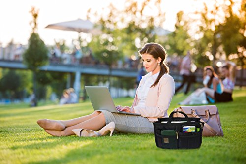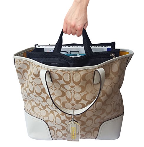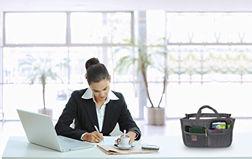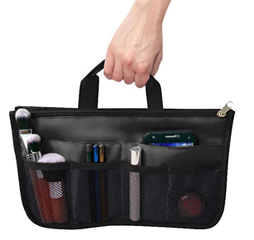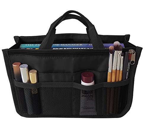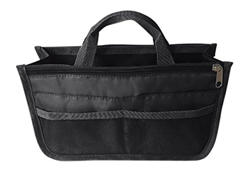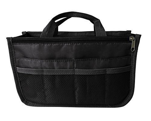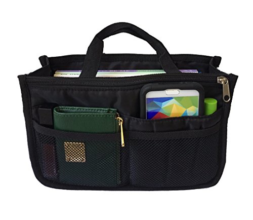 Product Description The RWC Portable handbag storage organizer, Purse insert, bag liner, travel organizer, keeps all of your essentials fully organized inside your satchel, tote, travel bag, suitcase, luggage, handbag, crossbody bag. Designed with thirteen pockets to offer plenty of storage and two sturdy straps to help you switch handbags with ease. This handy purse insert expands to maximize space in larger bags. Perfect to organize Mummy Handbag, baby diaper bag, baby stroller, backpack, gym bag, handbag of all types and sizes. Lots of space for makeup or cosmetics, toiletries, stationery, ipad, cell phone, laptop, books, magazines etc. No more searching through piles of stuff to find what you are looking for. Dimensions: 12.5" x 7.5" x 4 0