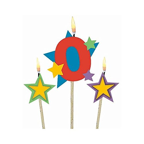Party Time Stars and Number 0 Celebration Candle on a Stick, Pack of 3, Multi , 7" Wax
