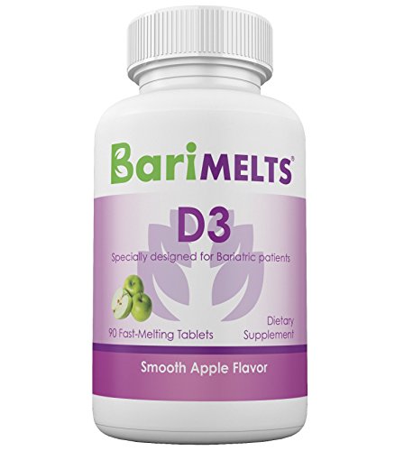 -. Binding : Health and Beauty -. Brand : BariMelts -. EAN : 0019962223556 -. Feature : Fast-dissolving, great-tasting bariatric D3! Promotes strong bones and teeth by increasing calcium absorption. Supports proper immune function and healthy cell growth. / Stick to your vitamin regimen easily with great-tasting tablets that go down smoothly / Specially designed to be gentle on your new system and not fill you up / The only Bariatric vitamin supplement on the market without artificial sweeteners - made with the world's most pure ingredients. A difference you can taste! / Sugar-Free, Gluten-Free, GMO-Free, Chalky-Aftertaste-Free :) -. Label : BariMelts -. Manufacturer : BariMelts -. ProductGroup : Health and Beauty -. ProductTypeName : HEALTH_PERSONAL_CARE -. Publisher : BariMelts -. Studio : BariMelts -. Title : BariMelts D3 Bariatric Vitamins -. UPC : 019962223556