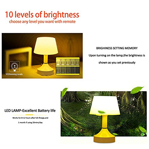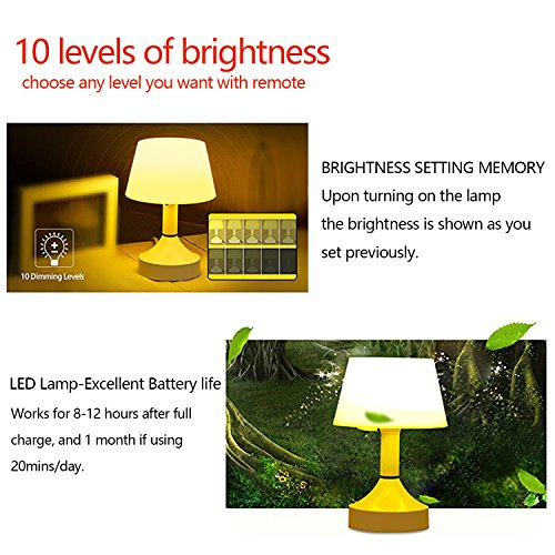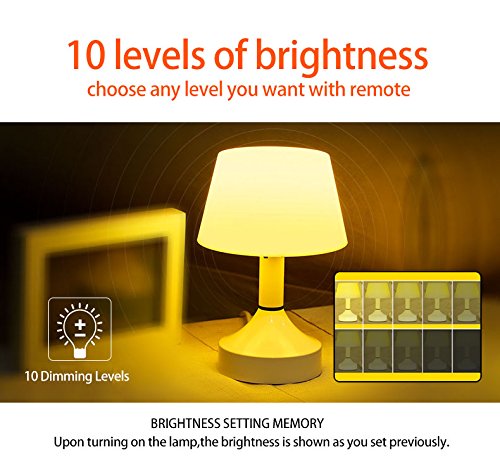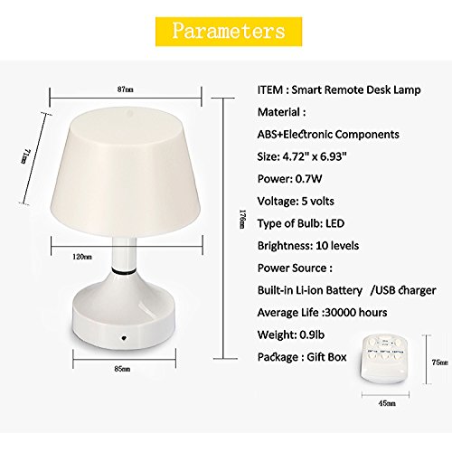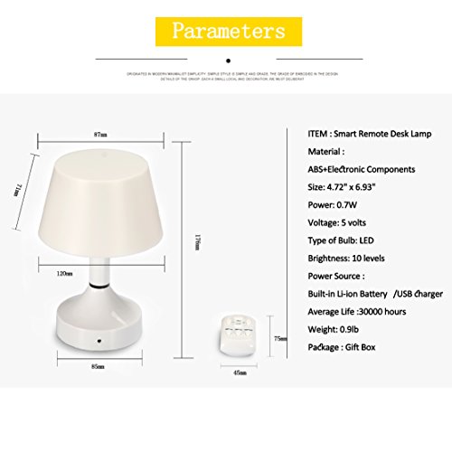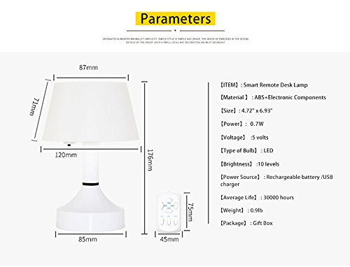 Remote Control when in the bed *It allows you to freely adjust the brightness and set timer with remote . All operations including power on/off and brightness up/down can be done in the Remote mode. Attention: Don't let any obstacles between the remote control and the lamp,otherwise the remote will lose effectiveness! Soft on Your Eyes *Using a light source of warm color system, it will be a gentle light to protect your eyes. The LED desk Lamp is powered by constant current and covered by PC diffusion cover, so it emits flicker-free and non- glare light, helping you avoid eye fatigue caused by flickering light and harsh glare as well as increasing the light emitting area. 10 Dimming Levels *The LED Desk Lamp offers 10 dimming levels ensuring that you're able to find the perfect light setting to suit your needs, a nice feature to have especially in situations when you're in the dark and the light is too bright to read something. *USB rechargeable desk lamp, energy efficient and eco friendly. *WARRANTY [100% Guaranteed Satisfaction, 30 Days No Hassle Money Back and 1 Year Warranty] Package Includes: 1 x LED TABLE LAMP 1 x USB charging cable [charging plug not included] 1 x Wireless Remote Control Kindly Note: There is no battery inside the package due to the limitations of FBA policies. It needs additional 2 AAA batteries for remote control. Thanks for your understanding. 0