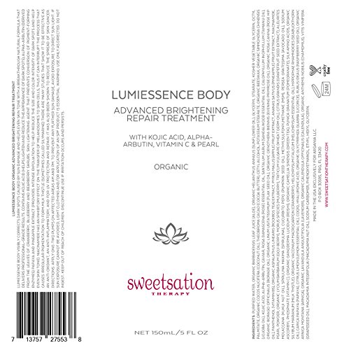 Lumi*Essence Body Organic Brightening treatment visibly corrects dark spots caused by excessive and cumulative sun exposure and helps to even out skin tone overtime. Contains Kojic Acid (helps lighten and reduce the appearance of dark spots), Alpha-Arbutin (derived from the leaves of cranberry, blueberry and bearberry shrubs. Skin lightening agent that prevents conversion of pigment-forming enzymes) Papaya and Pineapple extract (provides intense exfoliation to help reduce the size and color intensity of dark spots and help even skin tone overtime). Niacinamide has an inhibitory effect on the transfer of melanosomes to skin cells, thus it can interrupt the process that causes irregular pigmentation to form. Recommended use am and pm. Application of sunscreen of at least SPF 30 is mandatory while using this (and any kind of sun damage repairing) product. IMPORTANT NOTE: This product addresses sun damage related skin unevenness only. It may work the best on light to medium skin colors. If you suspect that skin unevenness you have might be due to: hormonal imbalances and pregnancy, genetic skin coloring and race, injuries and inflammation, certain types of disease or side effects of some medication, please consult your dermatologist prior to using this product.Feature